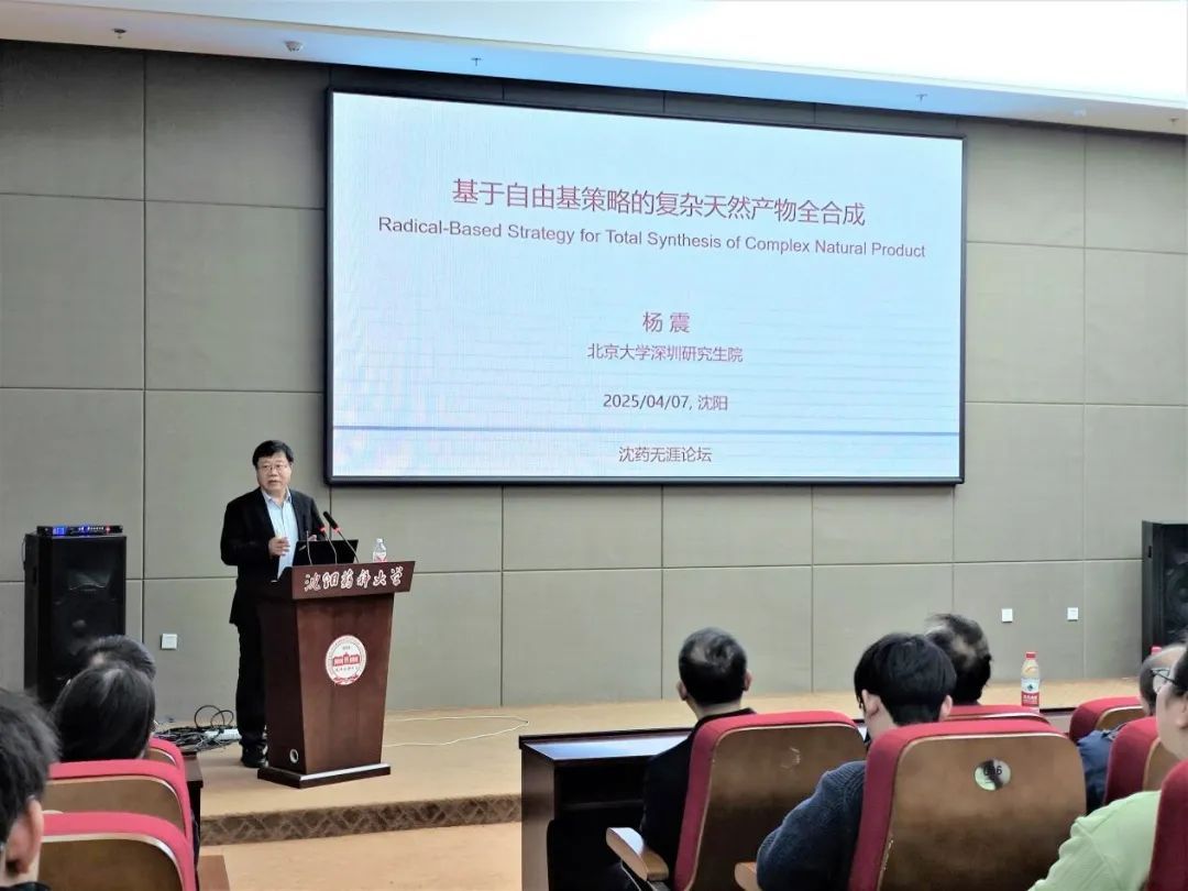 报告会上,杨震以“基于自由基反应的复杂天然产物全合成”为题作学术报告。他系统阐述了光化学合成策略在天然产物全合成领域的创新应用与研究进展,通过讲解其团队通过光化学调控自由基反应的多个实际案例,突破了传统合成化学中高难度分子构建的瓶颈,成功实现了具有多个季碳手性中心及高张力结构特征的多类稀缺天然产物的全合成。同时,介绍了研究团队凭借光化学反应其独特的光催化与能量转移机制,在C-H键直接官能团化、复杂环系构建及高选择性不对称合成等关键步骤中展现出显著优势,不仅大幅简化了传统多步合成路线,更为构建结构复杂的天然产物分子骨架提供了高效平台。报告结束后,杨震同与会师生就影响光化员工成产物的条件及其调控开展了热烈的交流讨论。