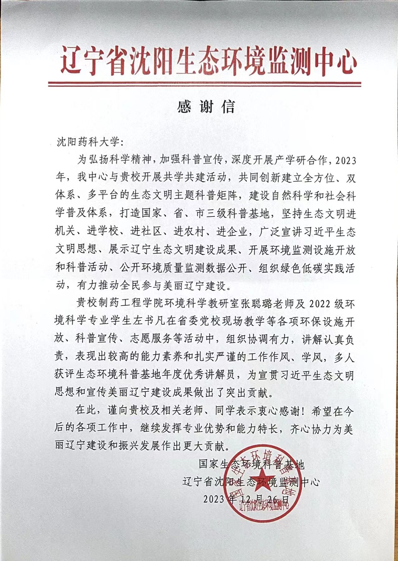 近日,三亿体育收到一封来自辽宁省沈阳生态环境监测中心的感谢信。信中对公司环境科学教研室张聪璐老师及2021级环境科学专业员工左书凡,在省委党校现场教学等各项环保设施开放、科普宣传、志愿服务等活动中的能力素养、工作作风和学风给予高度肯定和赞扬,对公司志愿者表示了由衷的感谢和诚挚的敬意。