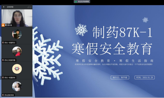 27日至29日,公司辅导员以期队或年级为单位,通过线上会议、安全知识问答竞赛、qq群和微信群推送相关安全信息等方式,向全体本科生及研究生进行安全教育宣讲,并通过公司官方公众号“沈药制药青年之声”面向全院员工发布寒假安全教育文章《“快乐放寒假,安全不放假”||老员工寒假安全提醒》,安全提醒主要包括外出安全、居家安全、防诈骗安全、食品安全四个方面,内容详实,帮助同学们提高安全防范意识和自我保护能力,营造了安全文明的假期氛围,督促同学们牢守安全底线,防患于未然。