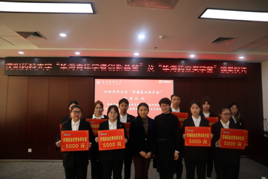 2020级硕士研究生孙曼曼代表获奖同学发言。孙曼曼用三个关键词“感谢”、“自豪”及“行动”来表达获奖后的激动心情,感谢华海药业对沈药学子的殷切关怀,感谢公司老师的谆谆教诲,并表示会带着这份感恩之心继续在永无止境的科研路上耕耘。