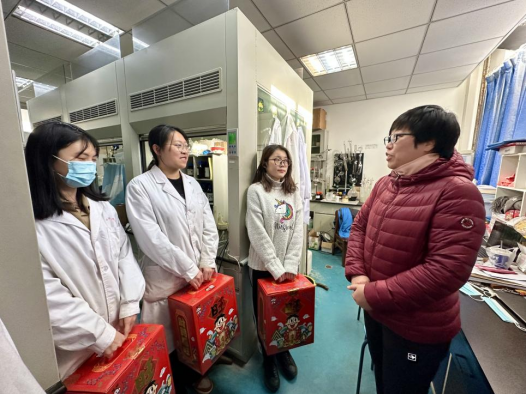 1月18日上午,李哲一行来到留校同学们的实验室及寝室走访看望、座谈畅聊,与同学们进行面对面交流。李哲与留校员工聊学业、话家常,了解他们的家庭情况、留校期间科研与生活情况,叮嘱同学们要严格遵守公司各项规章制度,做好个人防护,注意人身安全和身体健康,安全实验,在公司过个平安吉祥年。老师们还为留校同学亲手送上公司精心准备的新年礼包、水果与贺卡,为同学们送去家一般的温暖。