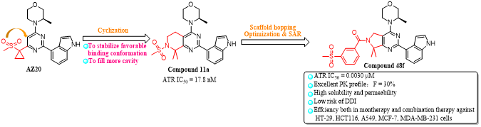 三亿体育官方网站赵燕芳/宫平课题组采用基于结构的药物设计策略,以AZ20为先导化合物,通过环合策略、骨架跃迁策略和多轮结构优化,得到了一系列四氢吡啶并嘧啶类衍生物,进一步优化得到了7,7-二甲基-6,7-二氢-5H-吡咯并[3,4-d]嘧啶类衍生物,其中化合物48f对ATR具有优异的抑制活性(IC50= 3 nM),对ATM缺陷的细胞LoVo (IC50= 0.092 μM)、SW620 (IC50= 0.145 μM)、OVCAR-3 (IC50= 0.127 μM)具有显著的抗增殖活性,与AZD-1390、顺铂、奥沙利铂、奥拉帕尼联用具有协同作用,优于阳性对照AZ20。化合物48f以浓度依赖性抑制LoVo细胞的克隆和迁移,且具有良好的药代动力学性质(F = 30%, SD rat)、可接受的PPB (Human: 99.7%, M. fascicularis: 92.1%, Beagle: 97.8%, Rat: 96.1%, and Mouse: 97.6%)和低的药物-药物相互作用风险(CYP1A2:IC50>10 μM, CYP2C9:IC50= 10 μM, CYP2C19:IC50= 1 μM, CYP2D6:IC50> 10 μM, CYP3A4-M:IC50= 1 μM, CYP3A4-T:IC50= 10 μM)。