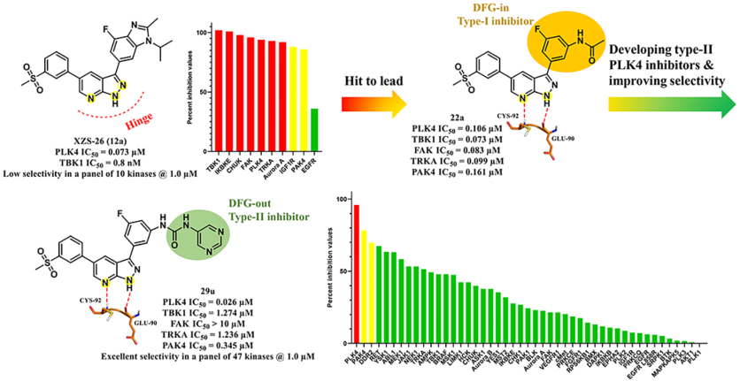 基于XZS-26与PLK4和TBK1的结合模式,在缺乏PLK4 DFG-out构象的共晶情况下,课题组通过同源模型方法构建了PLK4 DFG-out模型,并总结得到了II型选择性PLK4抑制剂所需的结构特征。基于该模型,课题组首次设计并合成了一系列高效高选择性的II型PLK4抑制剂。其中,化合物29u对PLK4抑制活性为0.026μM,且其表现出优异的激酶选择性和良好的体外类药性质,SD大鼠体内药物动力学研究表明化合物29u具有良好的ADME性质。化合物29u可作为用于发现以PLK4为靶点的抗癌药物的先导化合物和PLK4生物学研究的化学探针。此项工作为II型PLK4抑制剂的开发提供了新的思路。