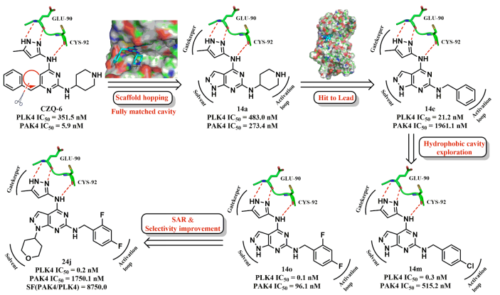 为了快速获得PLK4苗头化合物,课题组首先进行组内激酶化合物库筛选,发现PAK4抑制剂CZQ-6 (58.4% PLK4 inhibition at 2μM, IC50= 351.5 nM) (Figure 1)和TBK1抑制剂XZS-26 (92.9% PLK4 inhibition at 1μM, IC50= 73 nM) (Figure3)对PLK4显示出良好的抑制活性。课题组基于CZQ-6和XZS-26,设计、合成了两类结构新颖的PLK4抑制剂。