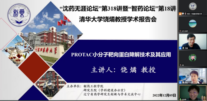 2022年12月5日下午,三亿体育、研究生院、辽宁省药学研究生创新与学术交流中心联合举办了“沈药无涯论坛”第318讲暨“智药论坛”第18讲,清华大学饶燏教授作了题为“PROTAC小分子靶向蛋白降解技术及其应用”的报告。会议由制药工程学科副主席刘洋教授主持,公司领导班子成员、研究生导师和研究生近300余人参会。