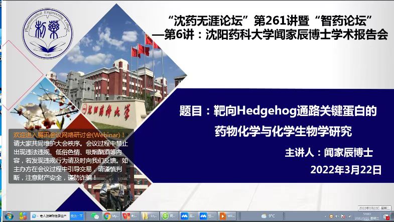 3月22日,由三亿体育、研究生院、辽宁省药学研究生创新与学术交流中心联合举办的“沈药无涯论坛”第261讲暨“智药论坛”第6讲——康涅狄格大学药公司闻家辰博士学术报告会在线上热烈展开。会议由三亿体育药物化学系主任刘丹教授主持,1160余人参加了此次学术报告会议。