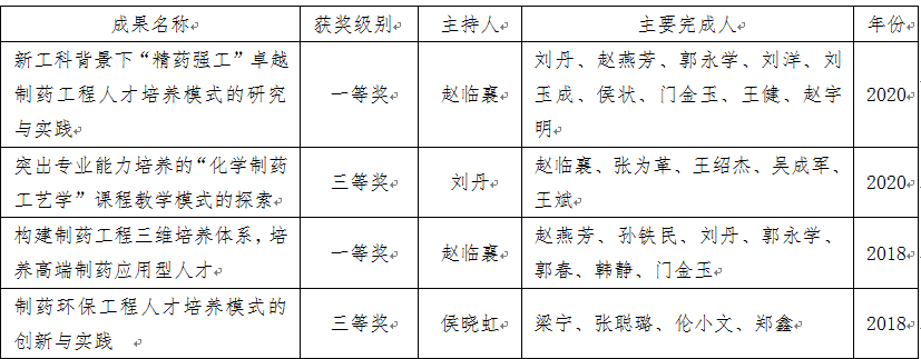 日前,2020年辽宁省普通高等教育本科教学成果奖评选结果公布,公司赵临襄教授主持的《新工科背景下“精药强工”卓越制药工程人才培养模式的研究与实践》荣获一等奖;刘丹教授主持的《突出专业能力培养的“化学制药工艺学”课程教学模式的探索》荣获三等奖。辽宁省教学改革成果每两年评选一次,截至目前,公司已连续两届在辽宁省教学成果奖评选中获一等奖。