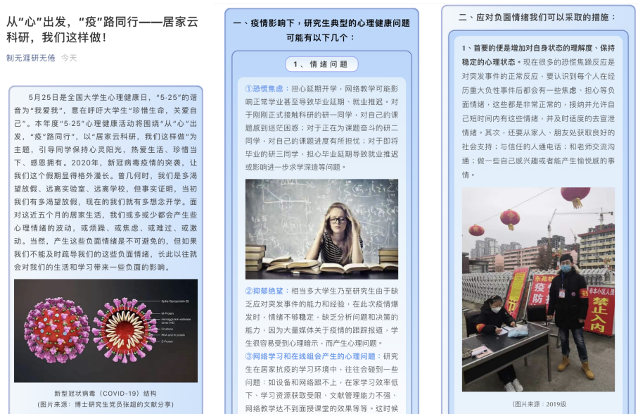 本次活动旨在引导同学保持心灵阳光,热爱生活、珍惜当下、感恩拥有。活动主要分为两部分。首先,由2019级硕士研究生党支部围绕疫情影响下,研究生典型的心理健康问题以及应对负面情绪我们可以采取哪些措施做了一期主题为——从“心”出发,“疫”路同行,居家云科研,我们这样做!的微信推送。让同学们坚定战“疫”信心,安心在家“云”科研,共识青年人的责任,谱写沈药人的担当。