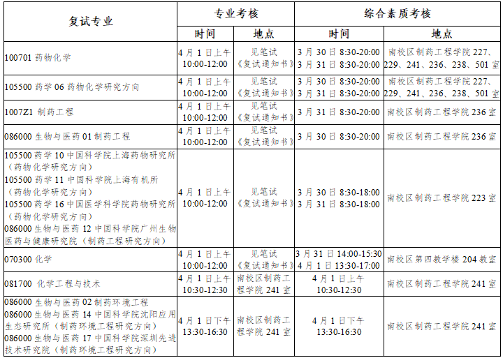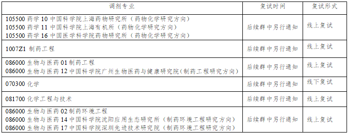 (一)复试专业代码及名称:100701 药物化学、1007Z1 制药工程、105500药学06药物化学研究方向、105500药学10中国科公司上海药物研究所(药物化学研究方向)、105500药学11中国科公司上海有机所(药物化学研究方向)、105500药学16中国医学科公司药物研究所(药物化学研究方向)、086000生物与医药01制药工程、086000生物与医药12中国科公司广州生物医药与健康研究院(制药工程研究方向)