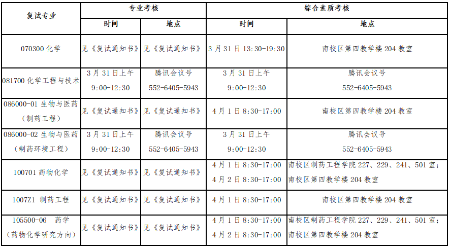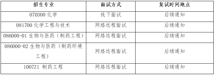 2.调剂考生复试: 4月6日-4月13日,具体安排以制药工程公司各招生学科通知为准。