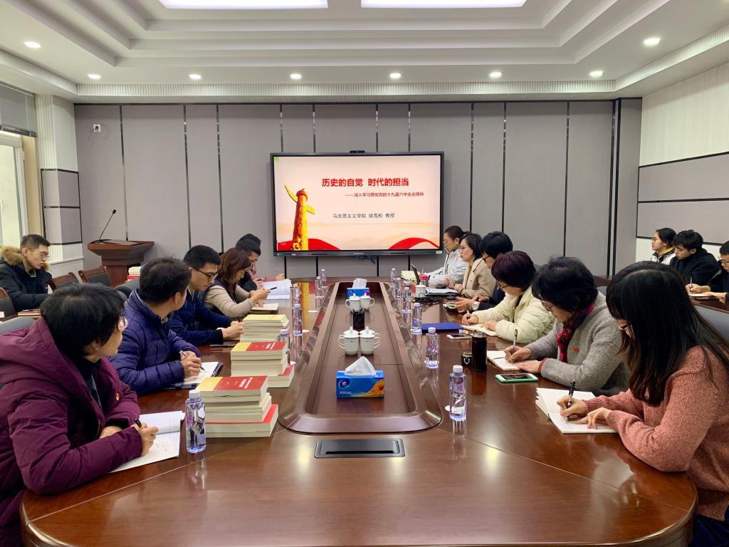 11月30日,公司党委在制药楼227会议室召开理论学习中心组学习会,专题研讨深入学习贯彻党的十九届六中全会精神,特邀马克思主义公司形势与政策教研室徐雪松教授作《历史的自觉 时代的担当——深入学习贯彻党的十九届六中全会精神》专题讲座,公司领导班子成员、系主任、院工会主席、党支部书记、全体员工工作干部参会,会议由公司党委书记李哲主持。